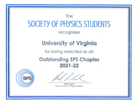 UVa’s SPS chapter has been named a 2021-22 SPS Outstanding Chapter, the 5th time in the last 7 years. This is the highest honor recognized at the chapter level and is only given to the top 15% of all SPS chapters in the country, with just 86 of 844 chapters honored so this year. The Director of the Society of Physics Students & Sigma Pi Sigma writes: “[...] your students should be proud [...] your students have earned this moment of recognition. Your combined efforts supported the department, helped further student development, and strengthened the community.”